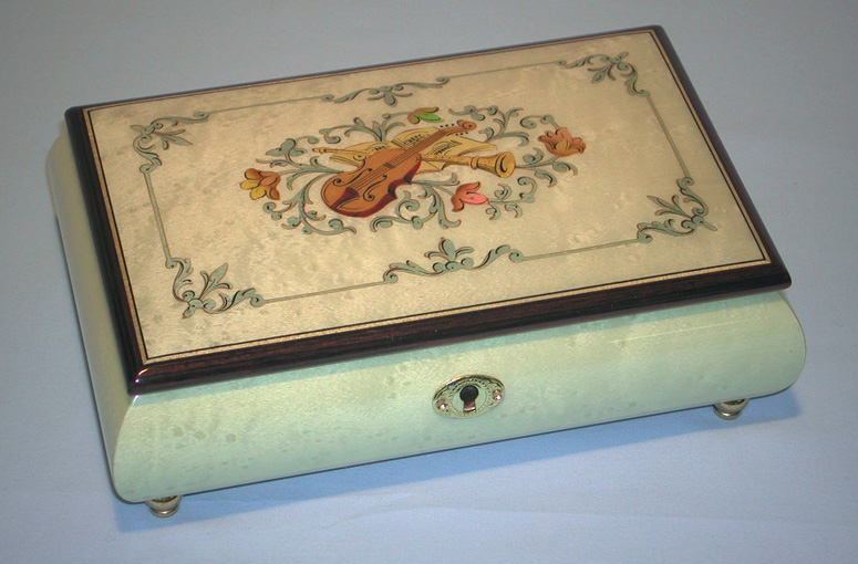 Musikdosenmass: 20cm x 13cm x 6 cm, Intarsien Instrumente, Lackierung Glanz, Musikdose abschliessbar,